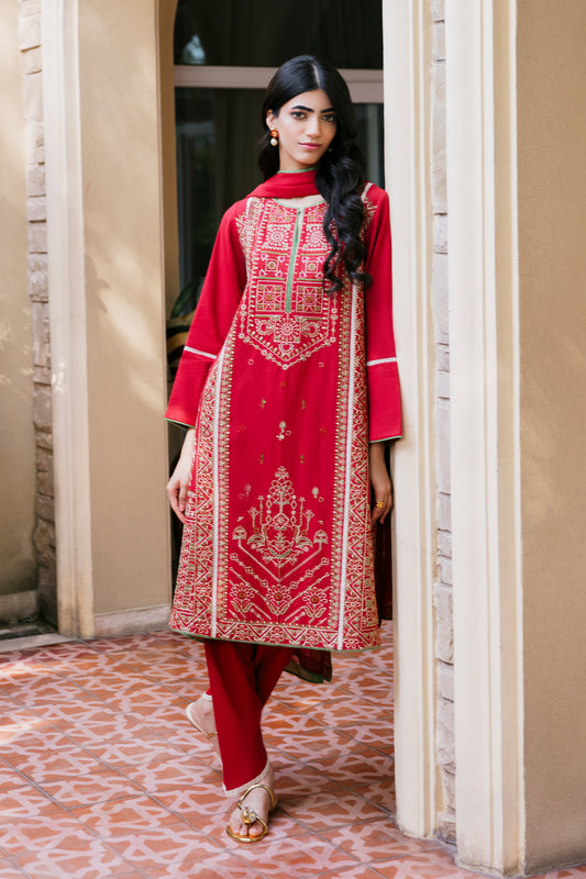 A timeless crimson ensemble adorned with intricate threadwork, this design celebrates classic heritage with a...
