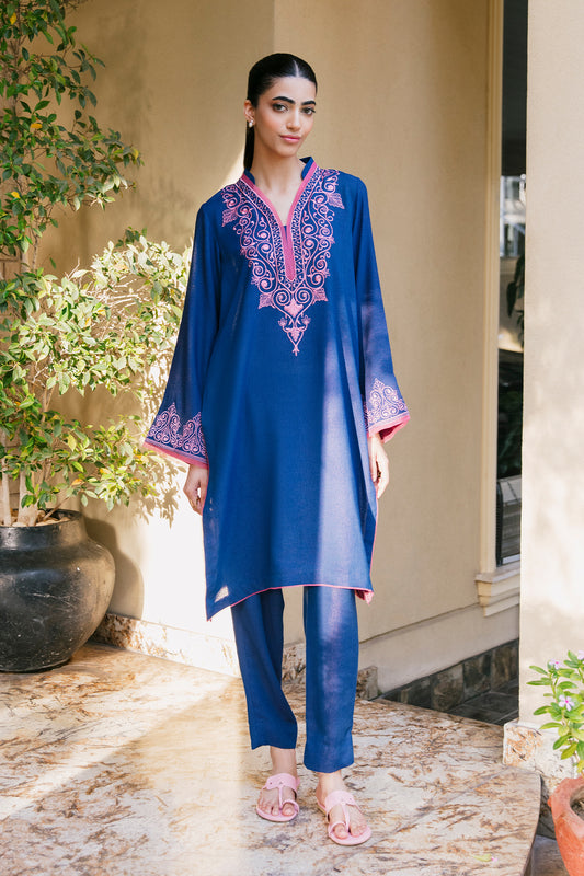 A striking sapphire blue ensemble adorned with soft pink threadwork embroidery, creating a refined harmony...