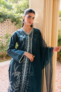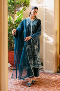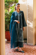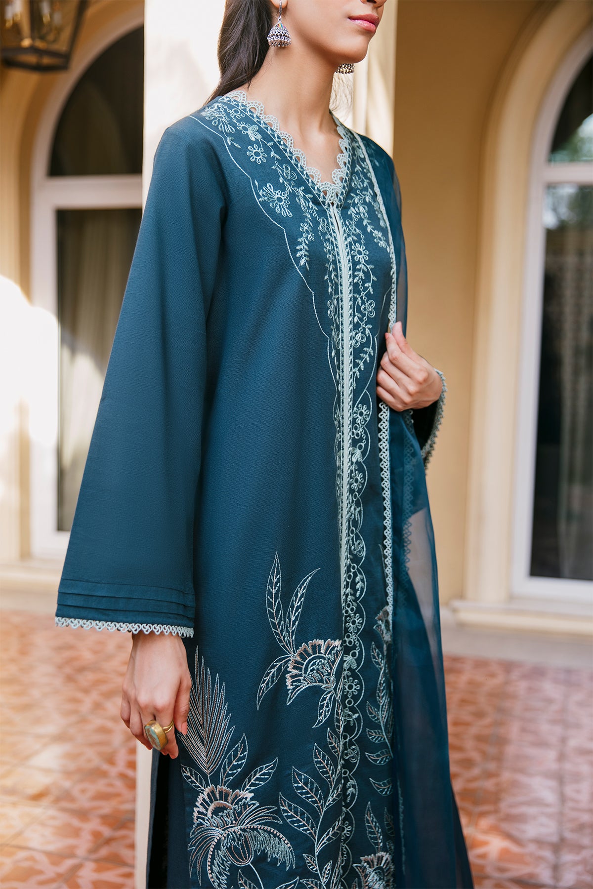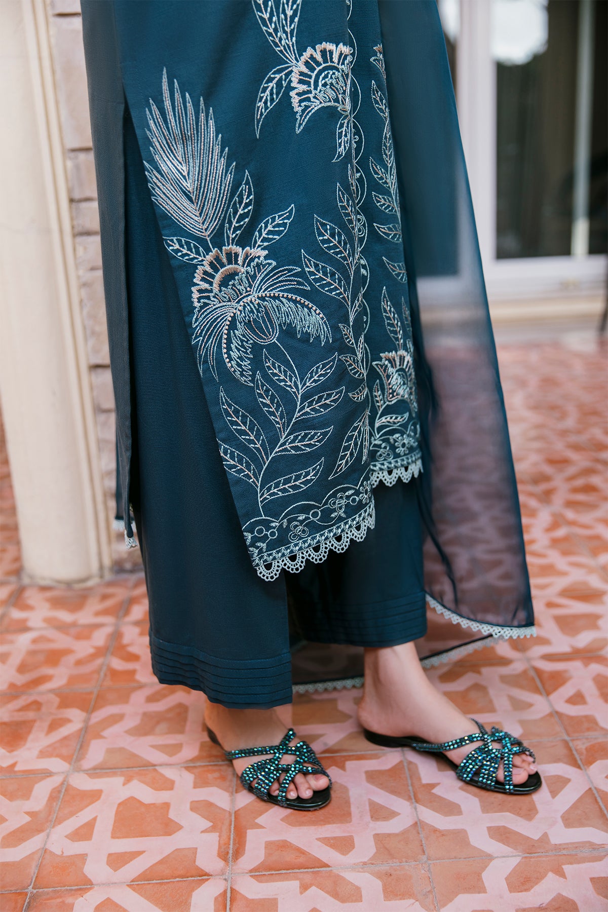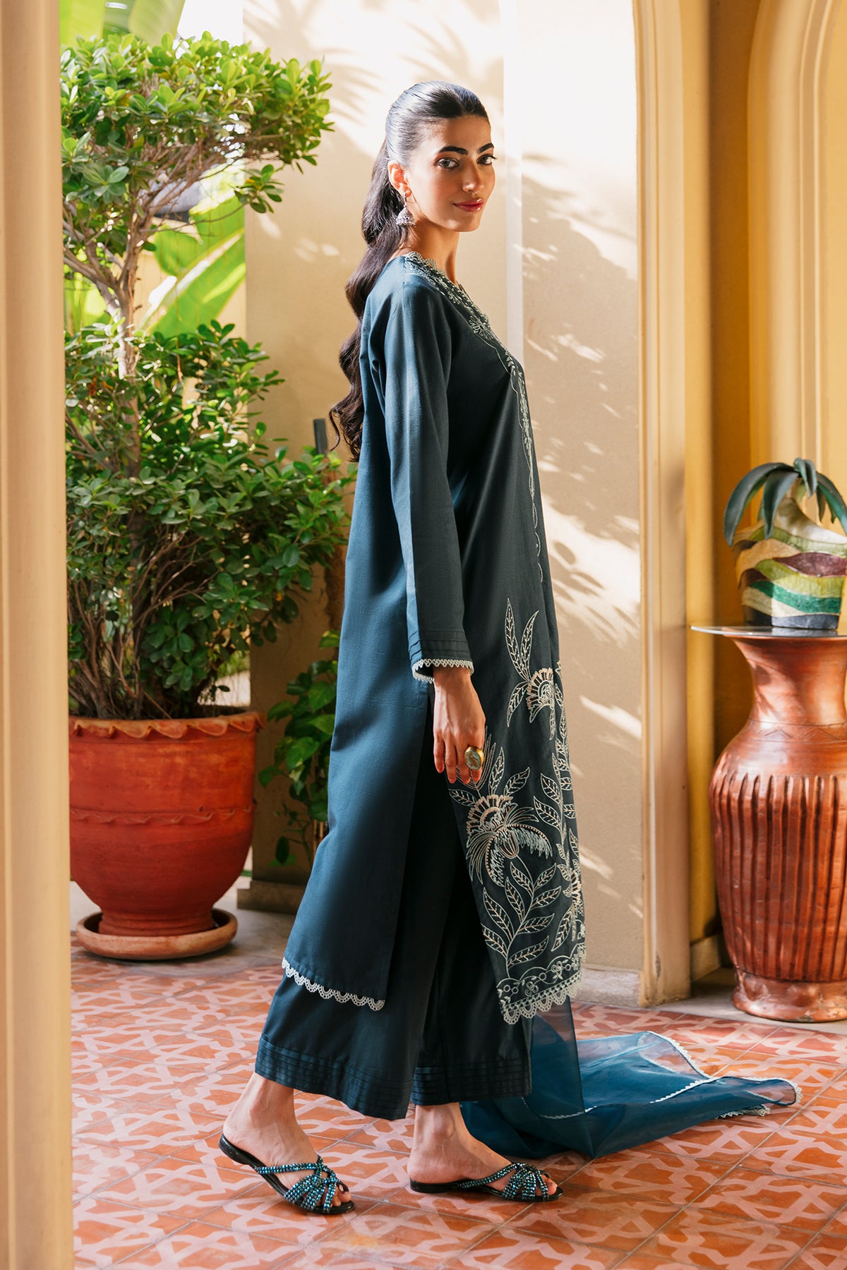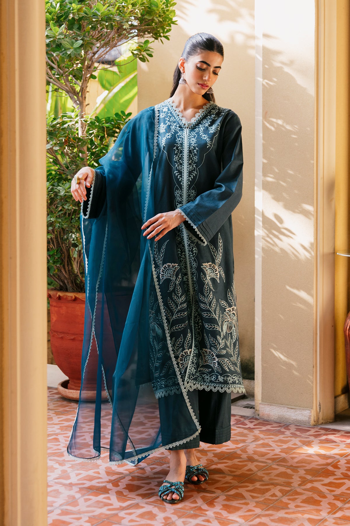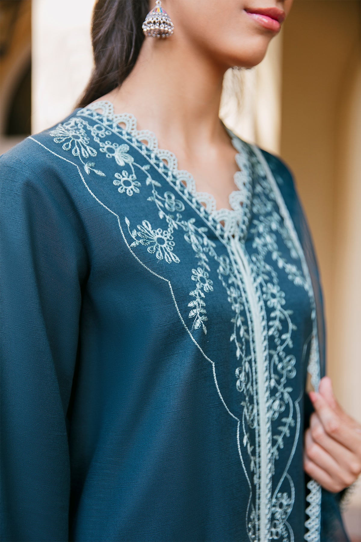 An ode to understated elegance — this deep teal three-piece ensemble is crafted on a breathable textured fabric, adorned with intricate threadwork that trails gracefully along the neckline, sleeves and hem. Delicate botanical motifs and fine scalloped edges elevate the design with quiet luxury. Paired with a pleated izaar and a sheer, finely finished chiffon dupatta, this look is perfect for intimate soirées, festive lunches or refined daytime occasions.