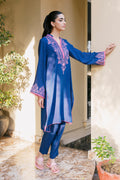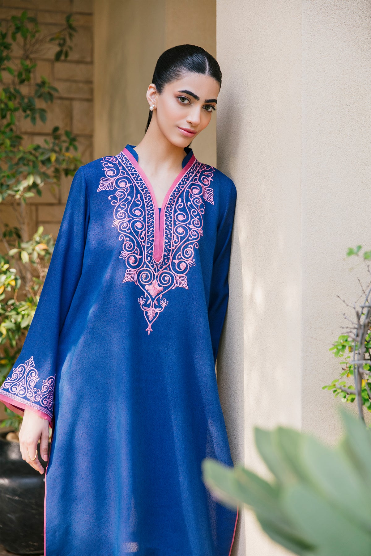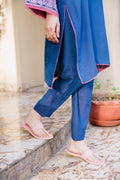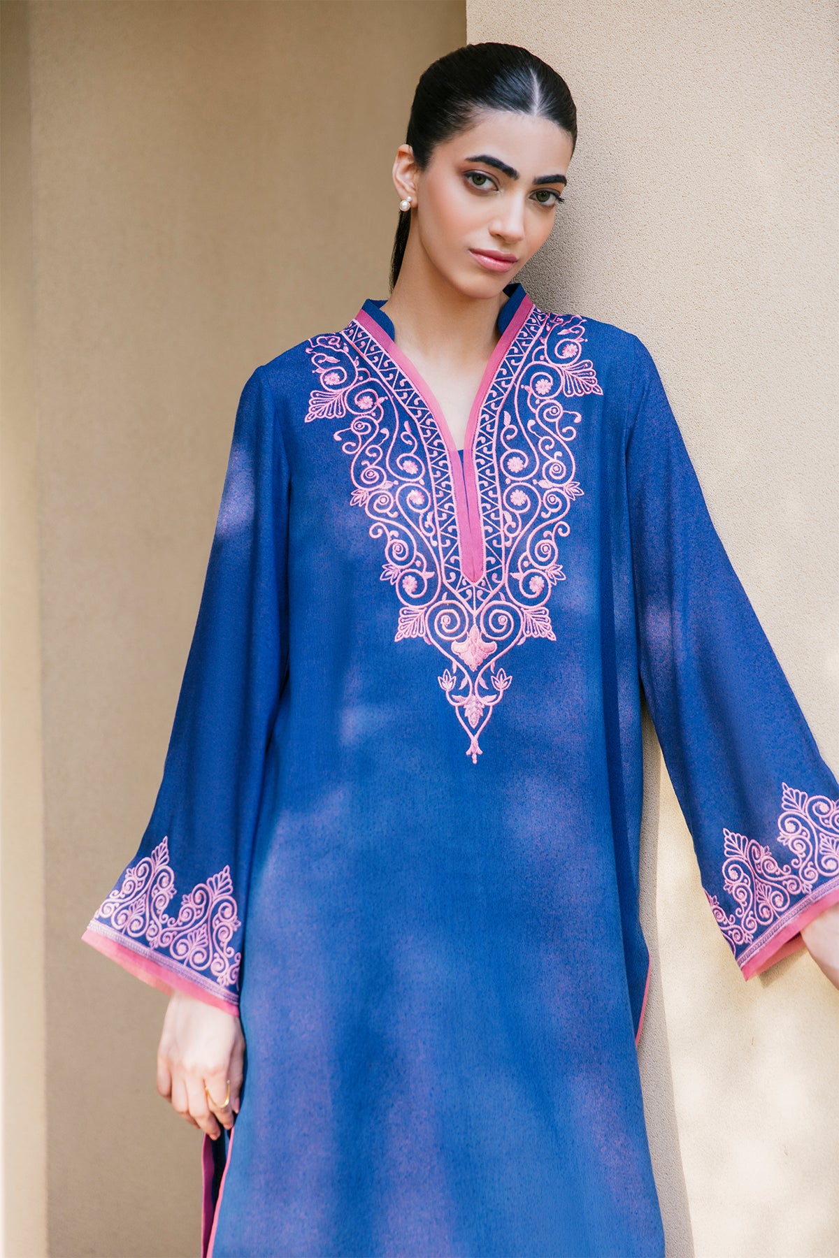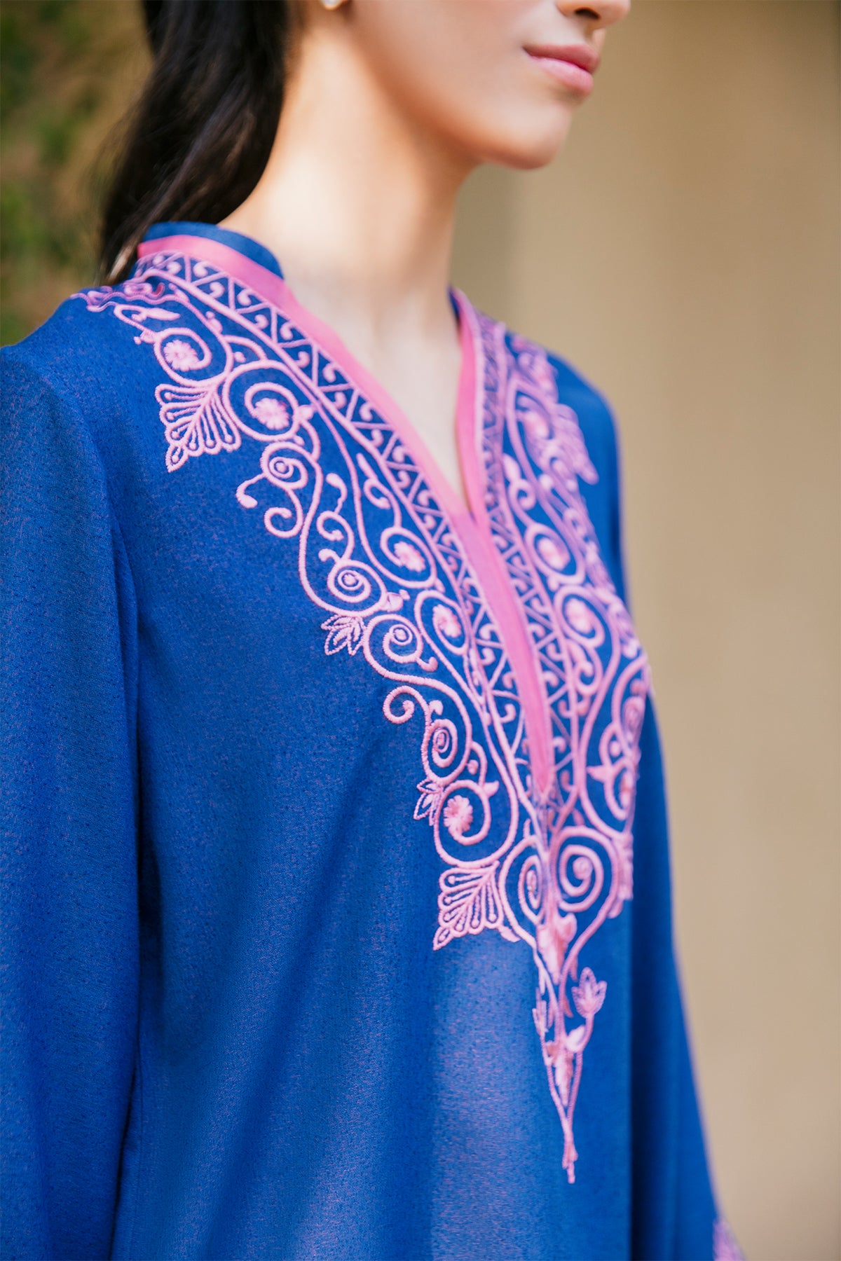 A striking sapphire blue ensemble adorned with soft pink threadwork embroidery, creating a refined harmony of contrast and elegance. The V-slit neckline and detailed sleeves add a feminine touch, while the straight tailored silhouette keeps it effortlessly modern. Paired with matching trousers, this look is perfect for graceful daytime wear — dignified yet relaxed.