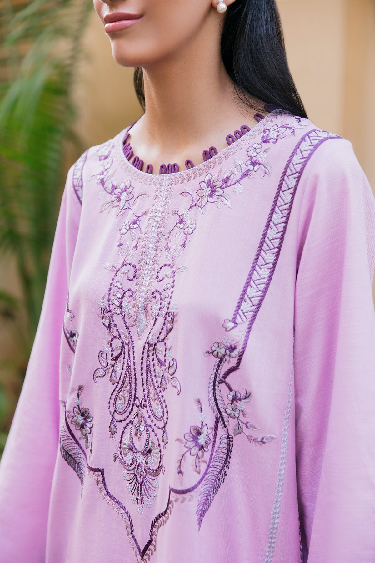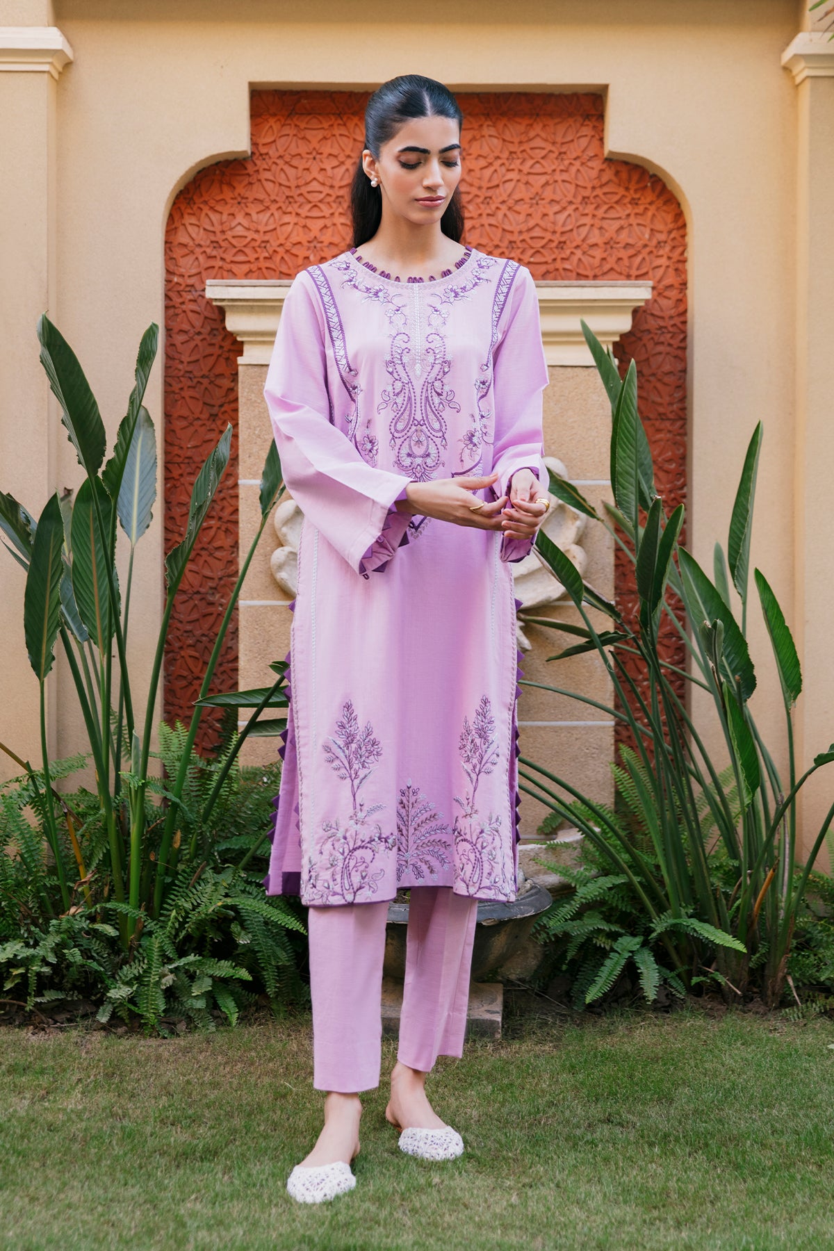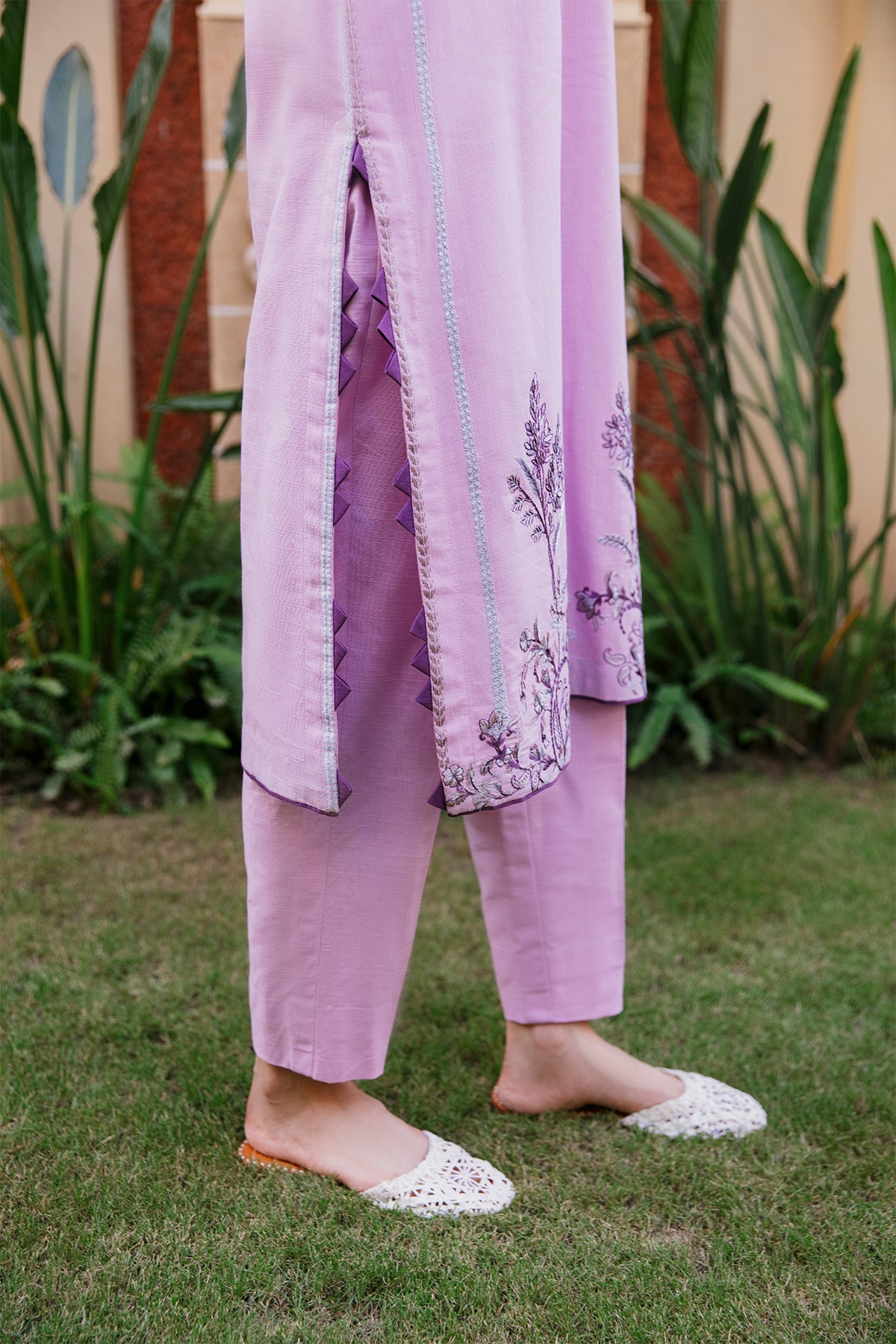 An elegant mauve ensemble adorned with delicate threadwork embroidery, this look blends feminine softness with timeless sophistication. The straight-cut kurta features detailed handcrafted motifs along the neckline and hem, complemented by classic straight trousers for effortless day-to-day wear. Light, breathable, and refined — a perfect expression of understated grace for the season.